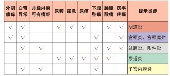 (3)非特异性阴道炎:外阴、阴道有下坠和灼热感,阴道上皮大量脱落,阴道粘膜充血,触痛明显。严重时出现全身乏力、小腹不适,白带量多、呈脓性或浆液性,白带外流刺激尿道口,可出现尿频、尿痛。