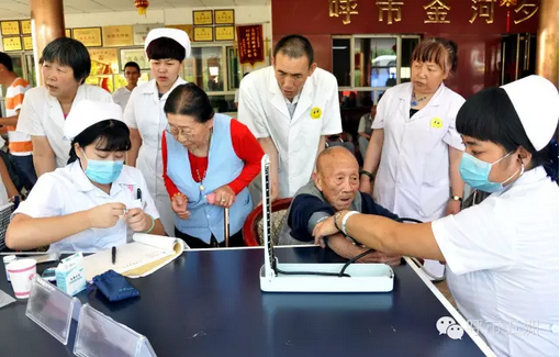 老人们听说医院大夫来了,都过来参加健康检查